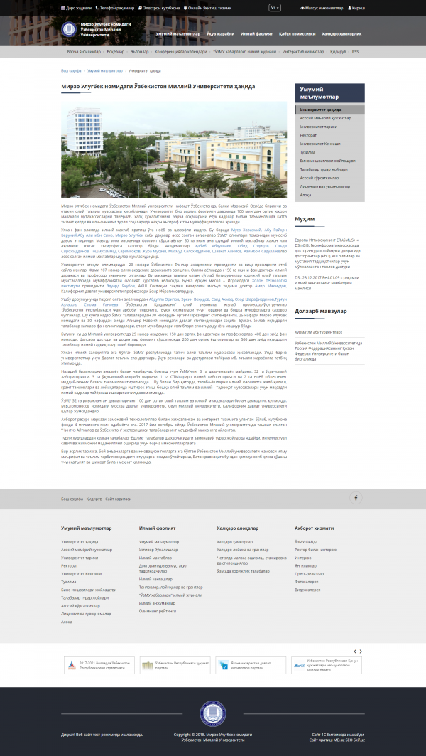 Национальный университет Узбекистана имени Мирзо Улугбека является первым и ведущим высшим учебным заведением не только в Узбекистане, но и в Центральной Азии. За столетнюю историю своей деятельности университет подготовил более 100 тысяч высококвалифицированных специалистов, внес большой вклад в обеспечение зрелыми кадрами всех сфер национальной экономики и добился признанных во всем мире успехов в различных областях науки